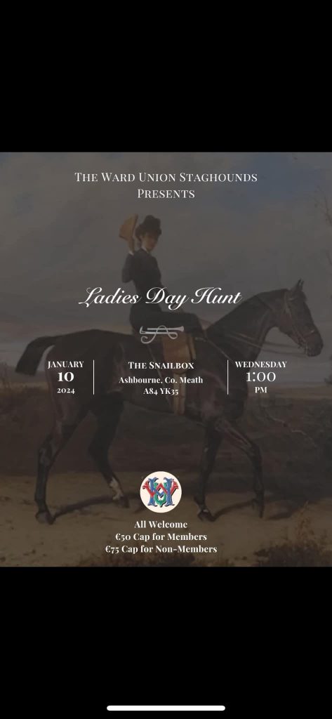 The Ward Union Ladies Hunt Meet is Wednesday 10th January 2024 at 1pm from the Snailbox, Kilmoon, Co. Meath.